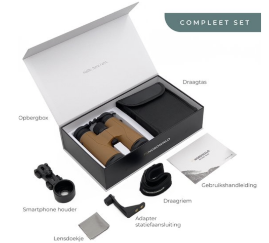 Verrekijker (8x42 of 10x42), smartphonehouder, statiefadapter, draagtas, nekkoord, drijvende nekband (alleen bij blauwe model), lensdoppen, reinigingsdoek, Nederlandse handleiding